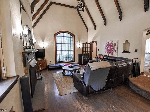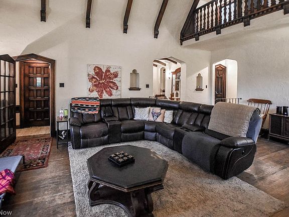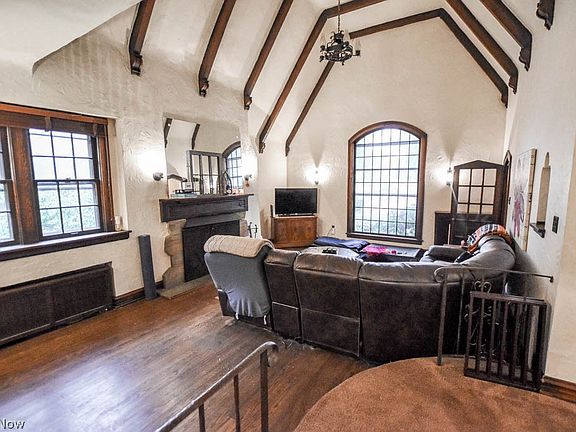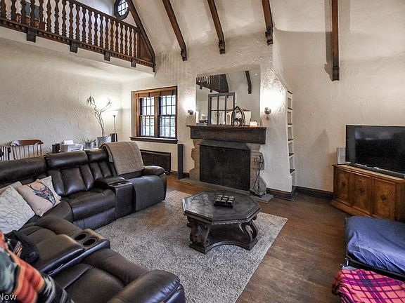 Quality craftmanship and 1929 architectural elements abound in this beautiful Ridgewood English Tudor! The generous main level offers a stunning living room complete with a vaulted beamed ceiling, hardwood floor, gas fireplace and an arched opening into the formal dining room with floor to ceiling windows. The kitchen preserves the classic charm while adding modern stainless steel appliances, tiled backsplash, a stainless steel sink with built-in drainboards and quaint breakfast nook to enjoy your morning coffee. Enjoy working from home in the private office with its original fireplace or use the rotunda with brick walls, wood plank ceiling and built-ins as a larger office or library. A desirable owner's suite on the main level includes a private full bath with step-in shower. Upstairs, you'll appreciate the view of the living room from the Juliette balcony on the way to the 2 upper-level bedrooms where you'll find hardwood floors, ceiling fans and porthole windows including in the f