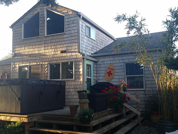 Unique Yachats ocean view property, just steps from the ocean: single-family home, or duplex with rental income - you decide! Remodeled with refinished Douglas Fir flooring; quartz countertops, propane ranges, stainless appliances in main unit, pellet stove and a wood stove flue. Quaint architectural features. Laundry area separates units; can be opened up for use as a single-family home. Two kitchens, 3 full baths, 3 bedrooms, 2 living areas, 1 dining area, a breakfast room; atrium bedroom with sitting area and reading nook; 1-car garage, laundry room, 2 large attic storages, back deck with hot tub, storage shed, fenced back yard, detailed landscaping. Currently licensed as vacation rentals. A 5000-sq ft lot on west property line, with tiny house and ocean view, is being sold separately.