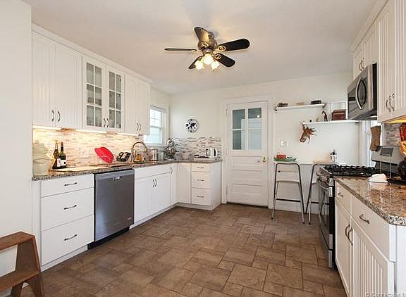 Bright and sunny cape in center of town. Convenient to everything. This house oozes with warmth and charm. Granite countertops, refinished kitchen cabinets, bay windows, wood and tile floors, sparkling stainless steel gas stove and refrigerator. Newer roof and windows. Screened sunroom and porch. Portable workshop in backyard stays. Must be seen to be appreciated.