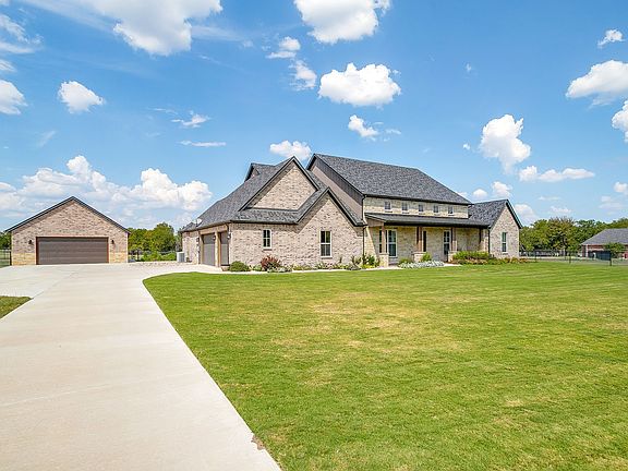 Welcome to 420 Cattlebaron Parc Estates, where luxury ranch living meets timeless Texas charm. This modern Hill Country inspired residence offers 3,343 square feet with 5 bedrooms, an office, 3 full bathrooms, and a 3 car garage, all thoughtfully designed for comfort, function, and style. Tucked inside the secluded and privately gated Cattlebaron Parc Estates, the home sits at the end of a gated, extended driveway and greets you with a large front porch. Step inside to an open concept kitchen and living area highlighted by soaring cathedral ceilings, hardwood flooring, and a floor to ceiling stone fireplace. The kitchen is a chef’s dream with an expansive layout, quartz countertops, and a huge walk in pantry, perfectly blending beauty and function. Outdoors, a spacious covered back patio with a wood burning fireplace extends your living space, creating the perfect setting for year round relaxation and entertaining. In addition to the attached 3 car garage, a detached 2 car garage provides extra storage or the ideal space for a workshop. The property's fully fenced and cross fenced with pipe no climb fencing, along with additional gates, allowing you to easily bring horses or a few head of cattle. Cattlebaron Parc Estates offers an unmatched lifestyle with exclusive community amenities including a clubhouse, pool, park, and riding trails. Located within the acclaimed Silver Creek Elementary zoning and just a short, convenient commute to Fort Worth, this home delivers the rare combination of comfort, wide open space, and accessibility.