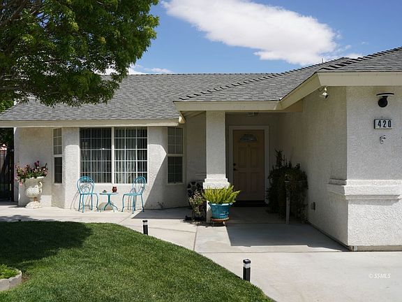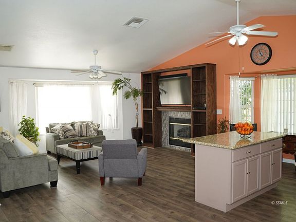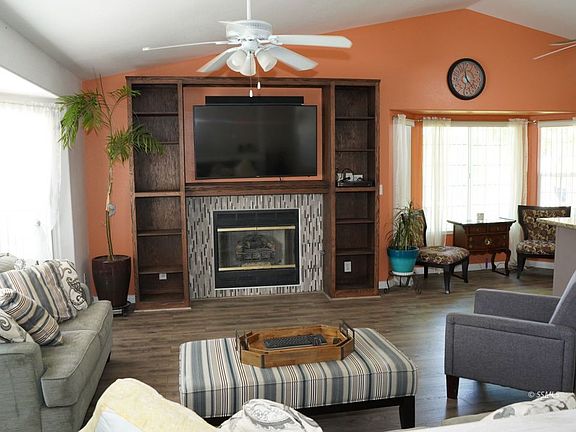 Striking cathedral ceiling really open up living, dining, kitchen area. Two large bay windows in living room and gas log fireplace surrounded by custom made wall mantle. Dining area can easily fit extra large table. Kitchen features a multi-functional island, upgraded earth stone countertops, oak cabinets with all pull-out drawers and upgraded kitchen appliances. Hallway is wide and features 2 storage areas. Laundry room features storage pantry. Cathedral ceiling in super large Master Bedroom(13.5 x 21.5) opens with double entry doors, while its adjoining bathroom hosts a deep closet & mirrored doors. First bedroom uniquely has private entry into hall bathroom. All bedrooms with full-length mirrored sliding doors. Enclosed patio offers additional space for home office/workout room. Large front and back yard is perfectly maintained with blooming roses, a stately gazebo, storage shed, block walls, and lighted covered RV parking with custom wrought iron gates. Wide 2-car garage. Dual cooling unit both mounted on the ground. Forced air gas furnace. Comes with an alarm system. 3-minute walk to south Albertson's and Walmart!