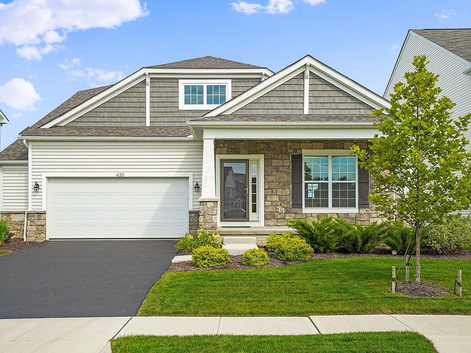 This newly constructed ranch features 3 bedrooms, 2 bathrooms and a 2.5-car fully insulated/finished drywalled garage. Custom finishes include wood casing on all windows, blinds, lighting/ceiling fans and a new water softener. The kitchen, family room, breakfast and morning room all come together at the heart of the home, giving a place that's perfect for entertaining. The owner's bedroom, boasting an en-suite bath w/dual-sink vanity, a spacious shower w/bench and a private toilet room. A laundry room ideally located next to the garage entry. The oversized basement has professionally painted floors and roughed-in plumbing for a full bath. Walking distance to the community pool/playground. If custom finishes and attention to details are what you want, this is the home for you!