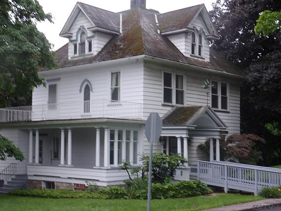 This classic older home, with over 2200 sq. ft., is on about a 3/4 acre lot in town. The lot fronts on 3 streets, has large mature trees, a storage shed and an in-ground pool. This grand 2 sty needs to be brought back to its original charm. The first floor features a kitchen, dining room, large entry foyer with fireplace, living room, 1/2 bath and family room with fireplace. The second level has three bedrooms and 1 full bath. The finished area on the third level could be a 4th bedroom. Attached is a 2 car garage and a multi-level deck.