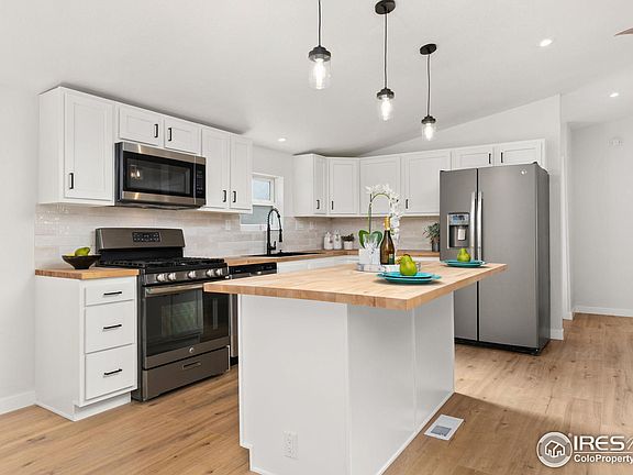 Back on the market at no fault to Seller or the Property! Discover the perfect blend of style and functionality in this FULLY remodeled 4-bedroom, 2-bathroom, Double-Wide mobile home located in the vibrant community of Lago Vista positioned in the middle of Loveland & Fort Collins. (Lot rent is $1150 per month) This home features a modern kitchen w/ a sit at Island, exquisite butcher block countertops, sleek white cabinets and SS Appliances offering both beauty and durability. Enjoy the convenience of contemporary upgrades throughout, ensuring a comfortable and efficient living experience. Sitting on a large corner lot the fully chain-link fenced yard, providing privacy and a safe space for outdoor activities, along with a storage shed for all your organizational needs. Situated in a welcoming community, this home offers not just a place to live, but a lifestyle to cherish. Don't miss out on this exceptional opportunity!