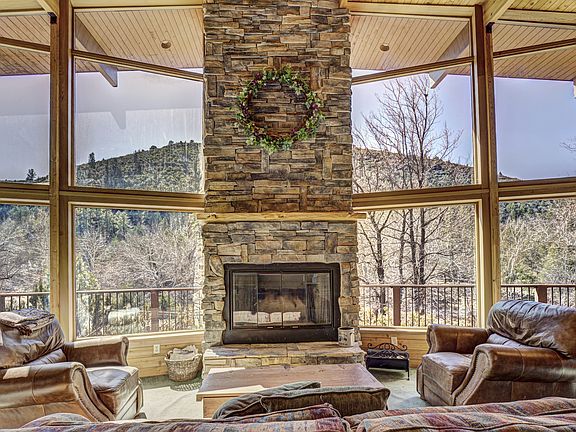 RIVER FRONT CABIN ON ACRE + CLOSE TO THE NATIONAL FOREST! Escape to this tranquil location and enjoy the serenity of nature, listen to the sound of the river and wind through the pines. This beautiful 3 bedroom/2 bath cabin has lots of wood accents with Tongue & Groove ceilings and walls throughout, wood floors, floor-to-ceiling stone fireplace, the open floor plan features a dining area and Great Room with sitting area and views to the river below, as well as a separate TV area. The modern kitchen has its own sun room/eat-in dining area with lots of light and views, knotty alder cabinets, breakfast bar and pantry. Upstairs there is a loft, perfect for a reading area or office, and split floor plan with large master bedroom with en suite bath and its own private deck to enjoy the panoramic views. The two guest bedrooms share a bath. Downstairs is a large work shop/storage area. The 1.3 acre lot is completely fenced and very level/useable, could build garage space, separate workshop, etc. Its an easy walk down to the river or into the National Forest. River-community homes are a rare find in this area -- relax on the deck in the evening and looking to the skies where you will see galaxies of stars. Some furniture/d?cor available by separate agreement. Enjoy the home with just your friends and family, or could also be an amazing VRBO opportunity!
