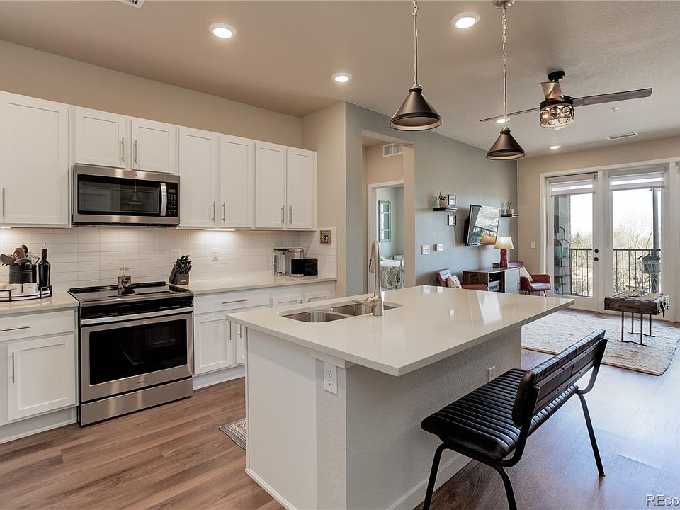 Gorgeous condo in Littleton Village neighborhood! Great location with a beautiful mountain view from the covered balcony. Modern interior finishes with designer colors and 10 foot ceilings give a spacious feeling. Luxury vinyl plank flooring throughout main living areas. The stunning white kitchen features gleaming quartz counters with an undermount sink, kitchen island & stainless steel appliances. Large primary suite & bathroom with oversized shower, dual sinks and spacious walk-in closet. Secure building with elevator access. Amenities include open rooftop deck with BBQ grills, sitting area & gas fire pit, exercise room with state of the art equipment, indoor parking garage, roomy storage closet, large open park, fenced dog park & playground area. This condo is like new, pride of ownership & meticulously maintained. Quick access to all the shops and dining at Southglenn Mall, Broadway, Downtown & C-470 and only three blocks to Highline Canal. This condo is ADA compliant with wide doorways and accessible counters. HOA Fee of $320 includes $22 per month for garage space. Six month minimum lease length for rental restriction. Motivated seller.