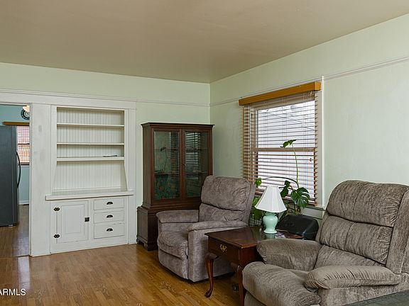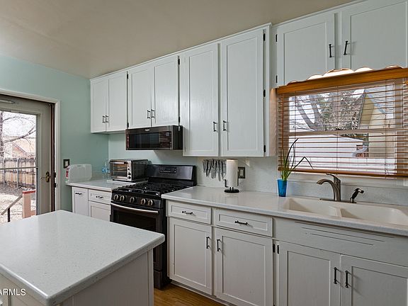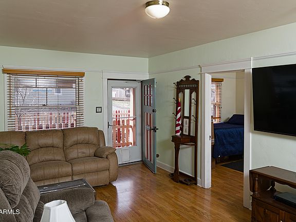 Enjoy this Historical Craftsman style home in the heart of Prescott with view of Thumb Butte. Perfect for full time living, vacation home, or business. Nostalgic picket fenced front yard with elevated covered front porch. Enter to the Living area with gleaming wood laminate floors and large windows offering lots of light. The two bedrooms are separated by a shared bath. Onto the large kitchen with tons of white cabinets offering lots of storage. Laundry room & second bathroom adjacent to kitchen. Back door leads to the backyard with gated access from driveway and additional gated concrete pad perfect for outdoor celebrations, or toys. On to the 504 sf carriage house with electricity. Could become a studio apartment or art studio. This is a must see to envision your dream