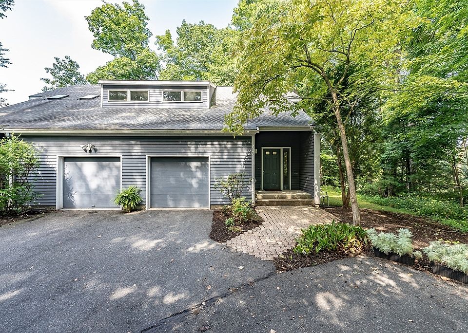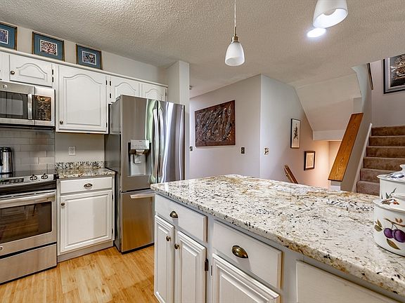 Prime Fairway Village location! Privacy abounds at this end unit, set high above the golf course & surrounded by woods & nature, on a dead end w/ only one other unit near it. Updated open kitchen includes stainless steel appliances & granite countertops. Bamboo flooring throughout the first level complements the bright living/dining room, w/ a corner wood-burning fireplace. The first floor half bath/laundry room has granite countertops that match the kitchen, plus extra storage space. Second floor has a large primary bedroom with en suite bath featuring a Jacuzzi tub, skylight, & marble flooring. There is also a 2nd bedroom with double closets, and a 2nd updated full bath. A bonus space on this level is perfect for a reading area or home office. The finished basement is perfect for workout or den space, with 2 rooms for flexible living/extra storage. Brand new deck and patio are perfect for outdoor entertaining. Showings start at open house Sat.1:30-3:30, Sun. 11-1.
