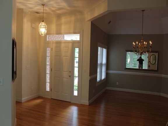 Immaculate 4 bedroom ranch style home on deep wooded lot with lots of privacy. Lovely living area with open floor plan. Oversized windows - lots of light . Kitchen has solid surface countertops and updated appliances. Heavy crown molding over windows and doors. Gorgeous view from large covered porch. Great family home. Pets 20 lbs. or under are ok, $50 per month pet charge. Lawn maintenance is included in rental fee.