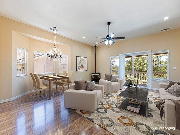 Beautiful Greenbelt views from this custom home in the desirable 55+ community of The Vineyard. Bright, Open floor plan with spacious common areas, freestanding fireplace and kitchen with Stainless Steel appliances, tile countertops and adjoining dining space. Private owners suite has a large walk in closet and double sliding doors to access the full length covered porch and ensuite bath with double sinks, large soaking tub and separate shower. The peaceful back yard offers beautiful tiered landscaping, mature shade trees and gorgeous Redwoods. Outdoors, there is also a community swimming pool, bocce ball and shuffleboard courts. There are also two beautiful ponds, which are each surrounded by lighted walking trails. Must See!