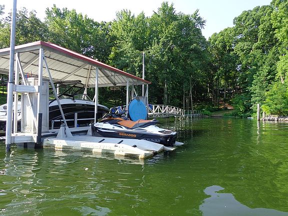 Waterfront Home at Cypress w/dock situated on 2.4 +/- acres on Beautiful KY Lake, 4 bedrooms & 4 1/2 baths with open floor plan to enjoy the views and entertain. Main level has 3 brs 3 baths w/ huge master suite to deck overlooking lake with incredible views. Downstairs has a large game room with 2nd master suite w/fireplace. Road way down to private covered boat dock with boat lift & Sea-Doo ramps. Two detached garages and a huge storage building with great storage for boats,RV, campers, golf carts, four wheelers,etc. High speed internet, natural gas and public water available. Large concrete area for basketball or other activity Sq.footage from County records. Near Marina and Boat ramp