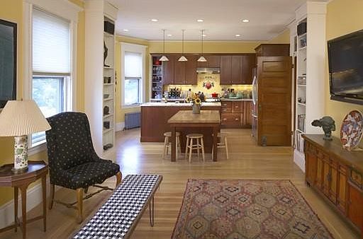 CAMBRIDGE ... Huron Village, gorgeous Philadelphia-style condominium in a classic Victorian-era two-family residence. Elegant details include nine foot ceilings and original wood wainscoting. First floor living area features a living room with a three-window bay, and a renovated, open dining room/kitchen with granite countertops, an island with a sink, wood cabinets, a butcher block table, and a door to the patio. Off the central hall are two bedrooms and a bathroom. At the end is the master bedroom with a full bathroom. A fourth bedroom is located on the second floor. A glassed-enclosed porch is currently used as a mud room. A pretty side yard is deeded to the first floor and contains a patio and lovely garden. There is off-street parking for one car. SELLER WILL REVIEW ANY AND ALL OFFERS AT 4:00 p.m. ON TUESDAY, SEPT. 29.