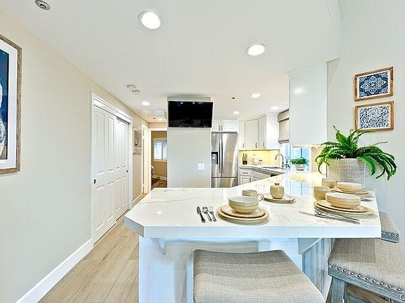 Completely remodeled with top quality materials. This is available fully furnished for a 6 to 9 month lease. It's all about LOCATION and this Bayshore Penthouse is not only close to the beach, shops and dining, but the unit positioning also makes it unique. .. NO SHARED WALLS. This unit is the larger square-footage layout. From the balcony you can enjoy small ocean view, beautiful sunsets and the ocean breeze. Fully furnished property, just bring your toothbrush. Both baths feature quartz stone in bath floors, counter and shower. Double sink in the master bath and walk in shower. Quartz countertops in the kitchen with all new stainless appliances. 2 parking spaces and brand new bike room! It does not get any better to live steps from the beach with the newer Pacific City within a 5 minute walk. A must see! Fully furnished.
