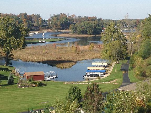 Call or text for more information 260-205-7649. Awesome vista water view and located on Jimmerson Lake connected to Lake James, Snow Lake, Big Otter, and Little Otter Lake. Beautiful 2BR, 2BA condo with pier on Jimmerson Bay and 1,400 sq. ft. of living space all on one level with no stairs. Large open living and dining area. Large Master bedroom with ensuite bath. 2nd Bedroom large enough to sleep 5 people currently with triple bunk and trundle bed. The large expansive living room and dining area is flanked by large windows overlooking a very scenic view as we are sitting on a hill overlooking Jimmerson Bay. The kitchen is very functional and open with white cabinets, beautiful quartz counters and subway tile backsplash...all appliances are the top-of-line Frigidaire Professional series including 5-burner gas stove, high-end quiet dishwasher, large frig with freezer. The flooring is awesome luxury vinyl plank wood flooring. Hands down the easiest flooring ever to maintain. It shows no dirt, is waterproof, and easy to clean with simple vinegar and water. Everything has been newly refurbished within last 2 years. Very nice composite deck with plenty of room for relaxing and eating el fresco while enjoying the beautiful vista view. There is an attached one-car garage with additional storage as well as a single detached garage with extra storage. There is a patio area in back for grilling and lounging. In addition to this wonderful location we also have an association pool and clubhouse with a full kitchen, Weber grill, bathrooms, and an awesome playground! Golf-cart/walking paths make easy access to the pool and docks. A dock is included that stays in all year. All mowing and snow removal is included in the association fees along with the pool and clubhouse use and common area maintenance. Our building has an awesome large common hallway/entrance that offers high-level privacy between the units. Another awesome highlight is we are located within walking, golf-cart drive to 5 high-quality restaurants and bars that are open all-year round! Our neighborhood is small and very friendly. The location of our building is very private and there is plenty of space for the kids and grandkids to spread out and play outside - ride bikes, skateboard, play ball - without the danger of high traffic. We plan to build a home almost next door to our condo! We will be neighbors! This community checks off all of the items we are looking for to live our lives on the lake, offer our kids and grandkids the adventures of fishing, swimming, boating, wake boarding, skiing, and making memories! Call or text for more information 260-205-7649.