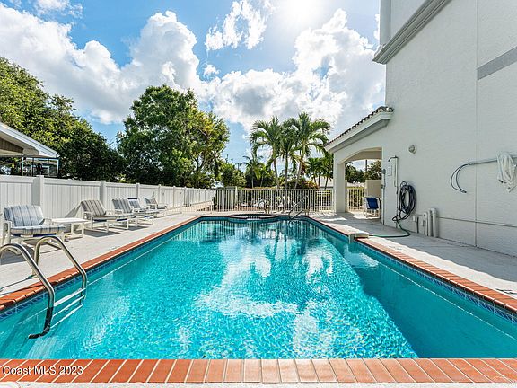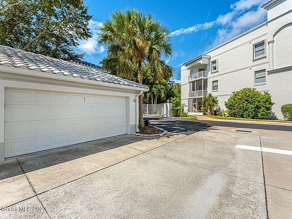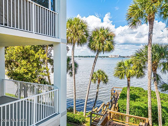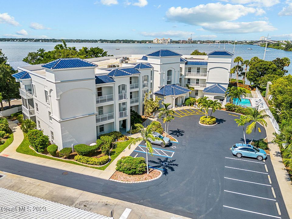Immaculate 2nd-floor corner end unit offers luxurious living and direct waterfront views! This 2004 built condo w/ private 2-car garage welcomes you to a low maintenance, relaxing lifestyle. Private gated community and heated pool offer security and exclusive outdoor enjoyment. Hurricane shutters, windows w/ plantation blinds and sliding glass doors are all only 2 yrs old. Primary Suite offers gorgeous sunset views w/ balcony access, 2 large walk-in closets, garden tub and remodeled shower in 2018. High eff. appliances & A/C keep bills low & interior cool. Recent upgrades include 2022 water heater, granite countertops, newer appliances, cabinets, kitchen sink & faucet, disposal, beautiful newer laminate floors, added crown molding and tall baseboards, laundry tub and more! Excellently maintained building - exterior repainted and parking lot resealed in 2023. Fantastic view from the balcony of Cocoa Village holiday fireworks as well as rocket launches to the north. Amenities are all within minutes making for an incredible location. Short distance to KSC, the beach, and only 45 min to Orlando MCO airport. Relaxation, security and enjoyment at its finest!