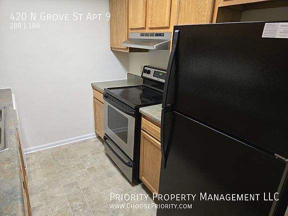 2 bedroom 1 bathroom apartment style living. -- 1st floor unit. 420 N Grove Unit 9 -- Brand New Living room carpet (carpet is in process of being replaced). -- New lighting throughout! -- Washer and dryer included! -- Assigned off-street parking! - -- Convenient central air & heat! -- Pet friendly upon approval, deposit, & fee! Cat only. -- Trash, yard maintenance, and parking lot snow removal included for no extra fee! -All Priority Property Management residents are enrolled in the Resident Benefits Package (RBP) for $20.95/month which includes renters insurance, HVAC air filter delivery (for applicable properties) and much more! Firm NO smoking. owner/agent. Utilities (electricity, water) are not included. Up to 2 cats, $50 per pet extra monthly & $300 refundable pet deposit required upon management approval. If you decide to apply for one of our properties, there is a $50 per adult application fee that is non-refundable. Anyone aged 18 or above who will be residing at the property must apply. We will (1) check your credit report; (2) check for any past evictions; (3) verify your employment, if applicable; (4) personal income must be sufficient and verifiable; (5) verify your previous landlord references; and (6) perform a criminal background screening.