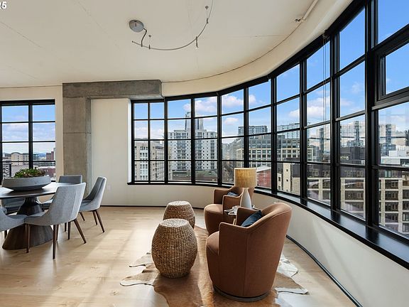 Jaw dropping views from 10th floor CORNER unit in the sought after Gregory! Barely lived in and beautifully maintained - the ideal Portland pied-a terre! Stunning curved south and west facing wall of windows offer expansive city skyline and west hills views! Spacious formal entry; gleaming refinished maple floors, dramatic 10 ft ceilings and custom window blinds. Open concept living offers flexible floor plan for your specific needs. Entertaining is easy in the sleek cooks kitchen with stainless steel counters, Energy Star appliances & cherry cabinets. Step onto south facing Juliet balcony and enjoy city views or let the fresh air in! West facing windows offer amazing natural light into primary bedroom with generous closets & full en-suite bath. Second full bath is perfect for guests. Washer/dryer in unit plus ample storage throughout. Enjoy the 5th floor rooftop deck for bbq's & gatherings! Coveted, secured parking space & storage unit with electrical and shelving included. Building offers bike storage; EV charging available; pets allowed per policy. Easy to lock up and go with fully secured building for a busy lifestyle. Premier building located in the core of the Pearl- walk or bike to iconic Powell's Books, Whole Foods, live theater art galleries and restaurants! Light rail is practically at your doorstep!