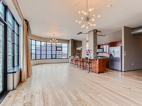 Gorgeous "Gregory" corner unit with curved wall of windows to enjoy the great city views! Pearl District living at its finest with dining, shopping, fitness and more all right out your front door, with a WalkScore of 99! Spacious open floor plan with hardwood floors through-out, faux balcony, room darkening shades, S/S counters, secured garage parking spot, additional storage room, commons include secured bike rack & amazing roof top deck area for entertaining or BBQ. Super convenient location is perfect for bike commuting or streetcar use as well.
