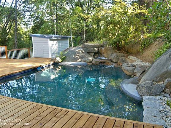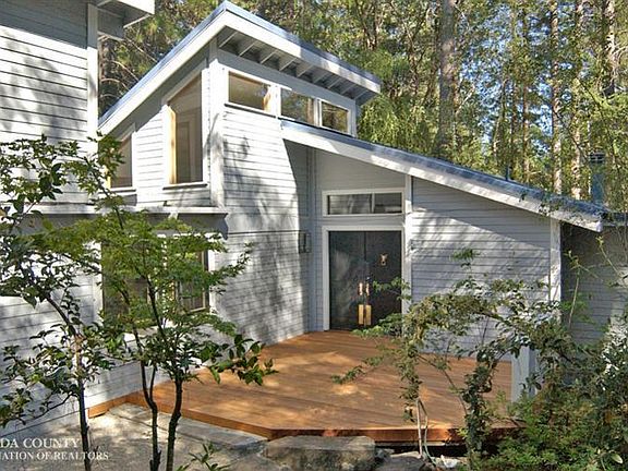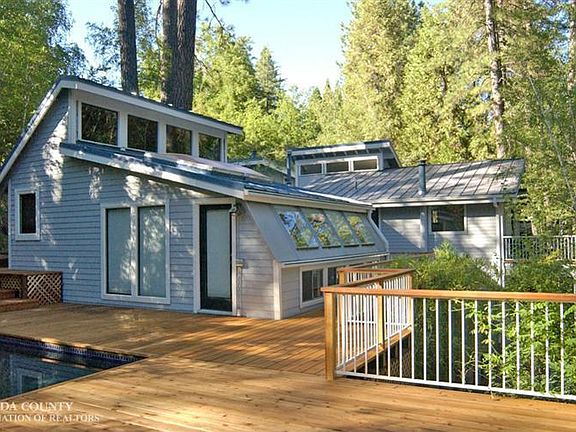 Rare and unusual! Very unique contemporary home nestled on a private and lush 0.80 acre parcel in City limits of Historic Nevada City. Bright open floor plan with dramatic vaulted ceilings and lots of windows. Large master suite is accessed by a cantilevered bridge and opens onto a private deck and swimming pool. Tiled kitchen looks out onto lower living room and has more wonderful windows and natural light. Attached guest quarters is ideal for h ome office or teens. Iron wood decking, towering pines and small pond makes this charming property most desirable!
