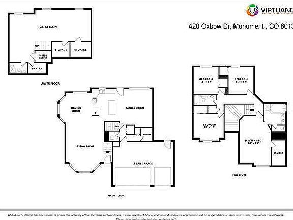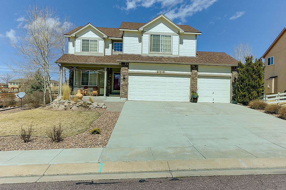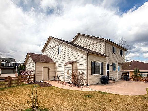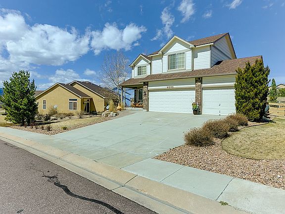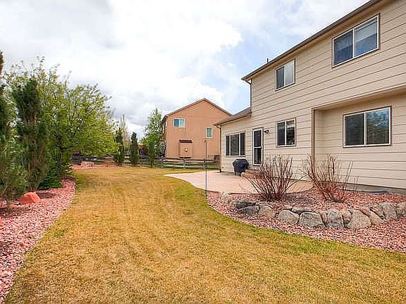 Dazzling two story with Pikes Peak views! Features include: Spacious gourmet kitchen with center island and breakfast bar, granite counters, under mount sink, SS appliances, walk out to patio, and hardwood floors that extend through the great room with large picture window and brick gas fireplace. Formal dining room with bay window, formal living room and a half bath complete the a main. Upper level features include: spacious master bedroom with vaulted ceiling, spectacular Pikes Peak view, walk in closet and adjoining five piece master bath, three additional upper level bedrooms and full bath. Lower level features a second family room and game area plus plenty of storage. Beautifully landscaped yard with automatic sprinkler system, surround sound w/ speakers in kitchen, dining room, great room and master bedroom, newer roof, newer carpet, A/C, fenced back yard, freshly painted interior and much more!