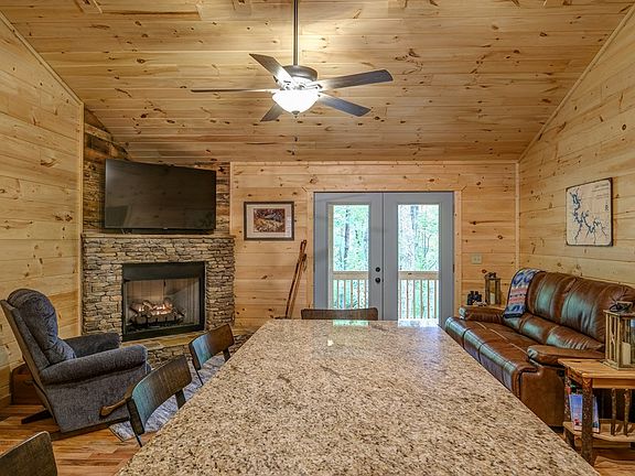 New construction feeling without the headaches or wait! FURNISHED CABIN with Log siding, metal roof, and an attached carport . A covered back porch on both levels is the perfect spot to relax. Inside your Great Room is a corner fireplace and French door access to your porch. Interior wood floors, T&G walls and ceilings throughout for that rustic charm. Your kitchen has Stainless appliances, gas range, granite, island/bar and main level laundry. Off your Great Room is your Master Ensuite with French door access to your porch, vanity, stand-up shower & walk-in closet. 2nd Master Ensuite with a standard tub, vanity & walk-in closet. Outside is a large crawl space. Oversized wooded lot with custom fire pit area that is so peaceful for evening fires to gather around with friends!