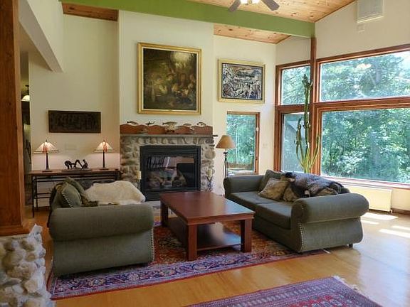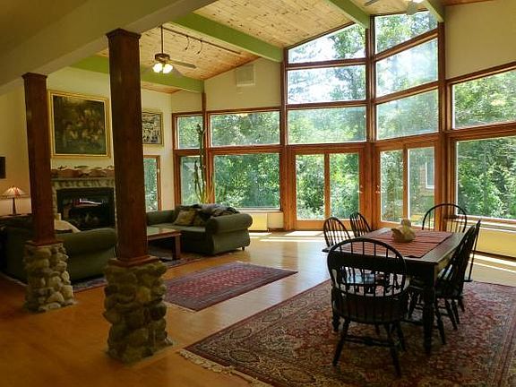 Custom Contemporary with light-filled Great Room offered for the first time ever! Sited well back from the road on 7 acres, the single-story home offers 4 bedrooms, 3 full baths, and two possible master suites: one an awesome Round house, easily separated as B&B for income. New kitchen with granite and stainless appliances, floors of beech and maple, stone fireplace, numerous special features with an awesome feel! Outdoors are two nature ponds, big fenced garden, open spaces and woods. Artsy 1-car garage/workshop, too. Open house Sat 9/16 11:30-1