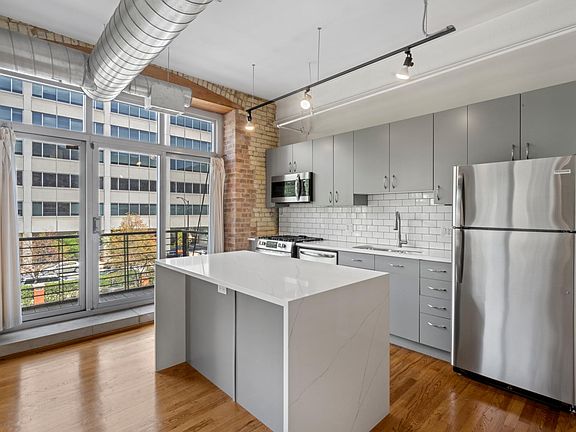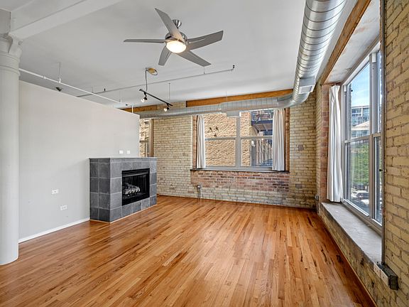 Gotham Lofts 1 bed, 1 bath, NW corner unit. Inviting loft space with a great layout, exposed brick, high ceilings, hardwood floors throughout and tons of light w/ large windows. This unit features an updated kitchen with quartz countertops, custom tile back splash, stainless steel appliances, in-unit W/D, cozy gas log fireplace, marble bathroom with dual access, and a private balcony off living/kitchen area with great city views. Quick walk to West Loop restaurants/ nightlife, super close to transportation and 90/94 and 290. Building features exercise room and rooftop deck. Gated parking space included! Available Sept 1. 12 month lease minimum