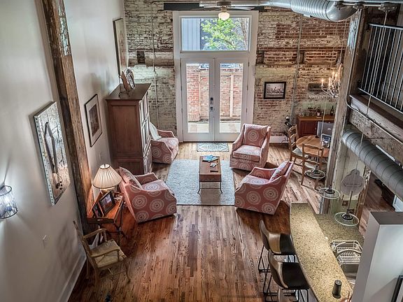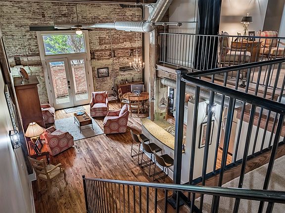 Unique loft-style 1st Floor Condo with 17' ceilings in open Living/Dining/Kitchen**Downstairs Primary BR w/private updated Bathroom (big new walk-in shower)**Beautiful real hardwood floors thru-out downstairs**Huge original wood beams, posts, ceilings, & exposed brick walls**2nd upstairs Bedroom, Den/Study, and updated Bathroom**Access to gated parking lot from private brick-walled patio**Additional deeded Parking Space across the street**Storage Unit** Rooftop w/great city & river views!