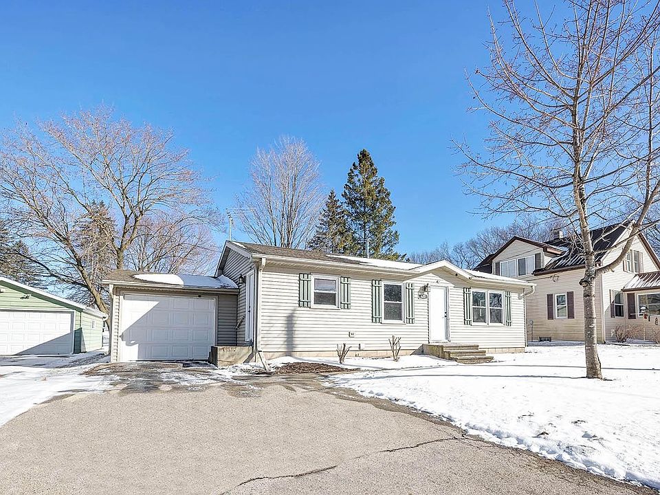 Ranch home nestled on deep lot w/dual garages. Sun-filled living room boasts updated flooring & flows into kitchen, showcasing stainless steel appliances, ample cabinet space & newer flooring. All bedrooms are conveniently located on main level. Lower level presents a partially finished family room adorned w/wood accents & built-in bar, awaiting your personal touches. You will also find a laundry area complete w/washer & dryer and lots of room for storage. Extra deep attached garage provides access to back patio, while extra 20x20 garage w/electric offers more storage or workspace. Property situated just minutes away from schools, hospital, golf course & scenic parks along Oconto River, featuring boat launches, parks and beaches.