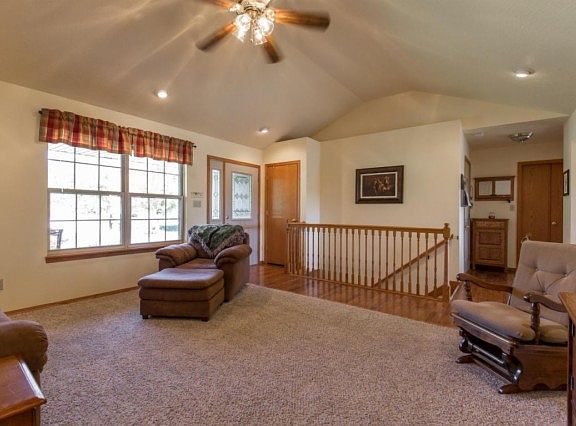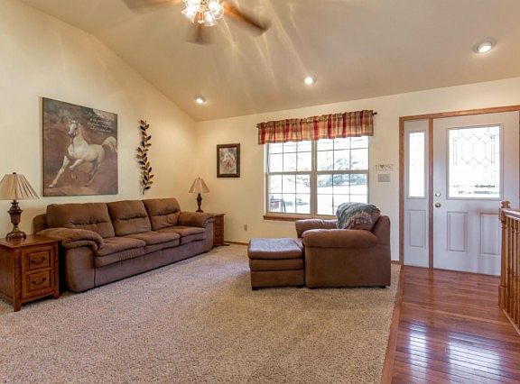 Beautiful 4 bedroom, 3 bath, 2 car attached/2 car detached home, located on 5 acres at the end of a quiet cul-de-sac. Home features covered front porch, spacious kitchen/dining combo offering vast amount of cabinet space, and access to the back deck. Master suite includes large bathroom with walk in shower, and jetted bathtub. Step outside from the master bedroom onto the back deck that overlooks acreage. Finished basement includes additional living area, potential office space, bedroom, bathroom, and a 6x12 safe room. New Anderson doors lead you outside to detached, heated garage. Property is great for growing families, and entertaining.