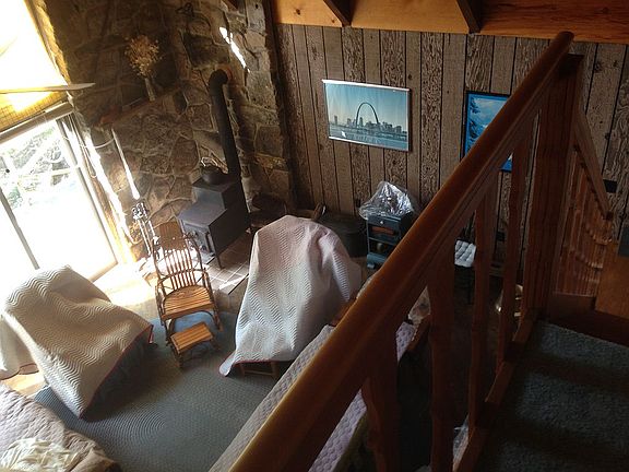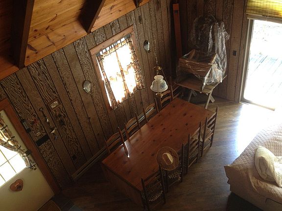 Chalet type with 36 x 24 footprint. Main floor living/dining area 24 x 20 with 20 ' cathedral ceiling, 2 bedrooms, bath, kitchen; 24 x 16 loft bedroom. Full basement, mostly unfinished with full bath and wood stove. Glass front with 24 x 8 Trex floored deck.