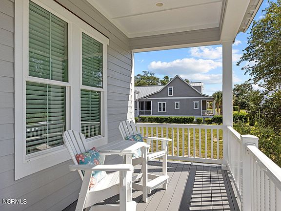 Elegant and easy coastal living awaits you in this lovely low country style home. 10 ft ceilings on the first level and 9ft ceilings on the second level give that grand open feel. Beautiful luxury vinyl plank floors are throughout the home for easy care. The kitchen is spacious and has extended storage and a pantry. In the kitchen you will find under the cabinet and in cabinet lighting, easy close drawers and tall decorative cabinetry. The living room is an open gathering spot for friends or family. A gas log fireplace surrounded by custom cabinetry completes this amazing space. You will find strategic use of pocket doors for the pantry and laundry area. Custom window treatments on the front exit doors and transoms. Wide slat blinds cover most windows. The primary bedroom with en-suite is on the lower level, two additional bedrooms and another en-suite bedroom await on the second level. The second level en-suite also has counter space with a small sink and refrigerator. Upstairs you can also relax on the Juliet Balcony overlooking the community pond. The back porch makes for a great area to relax after a day at the beach. Shower off the salt and sand in your outdoor shower. The Navian Tankless hot water heater makes sure no one will wait for hot water. The pervious paver drive makes for an attractive entrance. Ornamental metal fencing surrounds the backyard. If you like easy landscaping this home has it. There is a sprinkler system for the yard and all yards in the community: The HOA manages it. Sunset Landing is a small, gated community with less than 20 homes. The community boarders Bogue Sound and has a boat ramp for easy access. Sunset Landings location makes getting on and off the island a breeze. Head out to eat, to shop, to the beach you are just minutes away. Come experience island life.