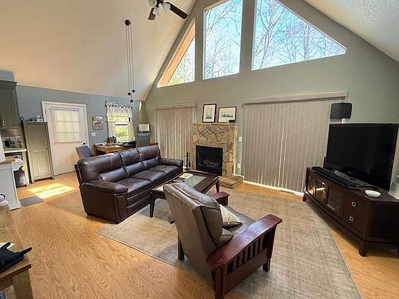 Charming 2-bedroom 2-bath chalet in Tarheel West. Conveniently located near downtown, shopping, dining, and schools. The bright open-concept living, dining, and kitchen area is highlighted by a beautiful stone gas-log fireplace and large windows. The main level offers a spacious bedroom, full bath, and laundry area. Upstairs, the primary suite includes a private bath, cozy dormer nook, and its own balcony. Dormer windows provide additional natural light throughout the living space. Enjoy outdoor living with an open deck, covered porch, and screened porch on the main level. The home has a new HVAC (2025) and exterior was newly stained and a new roof in 2022. Situated on a state-maintained paved road just minutes from downtown. Fees are for shared well.