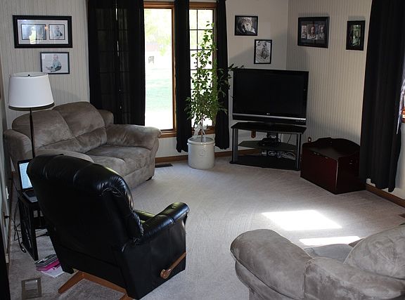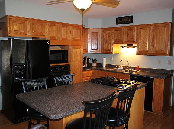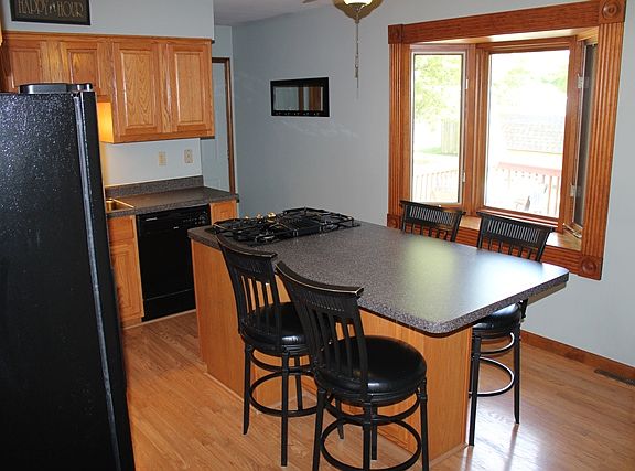 Updated ranch in one of the most accessible locations in town. Friendly neighborhood, near schools, playgrounds and golf course. Upstairs is 1200 sq ft featuring a 10x14 kitchen with bay window, 8ft island with built-in gas range, black appliances, new cabinets and counter tops, newer laminate floor. 13x14 master bedroom, 10x10 2nd bedroom, 6x9 full bathroom. 12x14 formal dining room, Family room is a 13x19 addition on crawl-space with wood burning stove, sliding glass door to deck and another bay window. Whole house attic fan. Downstairs has 400 sq ft finished with a 10x11 bedroom, 5x9 3/4 bath, and a 10x20 bonus room. Outside you will find a double driveway in front of the single garage, 16x16 deck with 6-8 person sunken hot tub that stays with the house. 8x12 storage barn is also included. Roof: 2006, water heater: 2009, A/C: 2006, Furnace: Original All kitchen appliances stay.