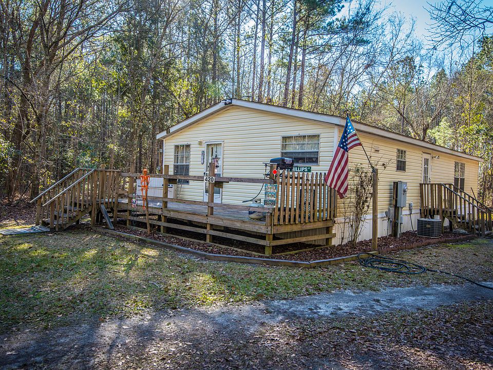 Great Deal! If you want Peace and Contentment along a lazy remote dirt road, this 1152 square foot double wide Clayton manufactured home (original owner) on a 1.8 acre wooded lot is for you! This property is located four miles west of Walterboro off Hwy. 64. For a less complicated life, sway the day away under the spell of a cool breeze on this almost 200 square foot deck while grilling out. Discover an abundance of wildlife, including deer, turkey and rabbits. Newly installed carpet! The oversized great room has vaulted ceilings and the bank of windows flood light throughout the area as the eat in kitchen is complemented with an office nook. A walk-in closet and master bath with a garden tub/shower complete the master bedroom suite. There is an additional bedroom and full bath. You'll be impressed with the double car carport which has a 90 square foot storage room, electricity included, and a pull-down door. The bonus 12x10 storage building likewise has electricity! Five hundred ft. deep well and a septic tank in addition to a 200amp service box. If you're looking for tranquility, nature, and a quiet lifestyle, look no farther, this is it!