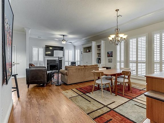 Welcome to Willowbend, a charming neighborhood located in Norman! This lovely home offers three bedrooms, two bathrooms, and a spacious two-car garage. The kitchen is a true focal point, featuring a spacious layout complemented by an inviting island, elegant Silestone countertops, convenient slide-out cabinetry, and a pantry to keep your culinary essentials organized. The warm wood flooring in the common areas adds a touch of natural beauty, while the crown molding enhances the overall aesthetic. The living room is designed for comfort and entertainment, boasting a built-in entertainment center and a cozy fireplace that sets the perfect ambiance for relaxation and gatherings. The primary bedroom is a haven of relaxation, complete with an en suite bathroom that includes a double vanity and a dedicated makeup sitting area. Enjoy a soothing soak in the jetted tub or rejuvenate in the stand-in shower. The ample walk-in closet offers abundant storage space to keep your belongings organized. Additionally, the secondary bedrooms offer versatility to suit your needs, whether it be a guest room, home office, or hobby space. Outside, the low-maintenance backyard presents a covered patio, offering a serene setting for outdoor enjoyment. The door leading out to the patio and back yard with the dog door insert can be replaced with the original matching garden door which is currently being stored in the garage. For added peace of mind during stormy weather, a storm shelter is conveniently located in the garage floor. Don't miss out on this wonderful home in the desirable Willowbend neighborhood, offering comfortable living, modern amenities, and a convenient location. Schedule your viewing today and make this your new home sweet home!