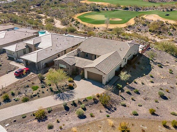 Majestic Latigo on Large Corner, Cul-de-Sac, Golf Course Lot! Primary Suite w/2 walk-in closets, Split Vanities, Large Soaking Tub, Separate Custom Tiled Shower, Golf Course and Mtn Views from the bedroom. Stunning Fantasy Brown Granite Counters in Kitchen w/SS Cafe Appliances. Corner Rolling Wall of Glass in Great Room/Dining Room letting the outdoors and indoors blend. Laundry Room w/sink and wine fridge. Casita features: Full built-in Wet bar and private entrance. Large Wood Look Tile in all wet areas, top down/bottom up blinds t/o. Backyard has Custom Travertine Built-in BBQ, Multiple Powered Sun Shades, Extended Travertine hardscaping leading to Stunning Pool.