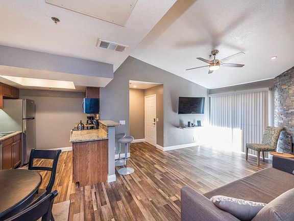 Fully furnished third floor one bedroom unit in a beautiful guard gated community in the heart of Las Vegas. Located right across the street from the Rio. Stainless steel kitchen appliances. Upgraded bathroom. Luxury vinyl plank flooring. Balcony with a view of the strip. Community has two pools and a gym. Water, trash, sewer, and internet included. Can come furnished or unfurnished.
