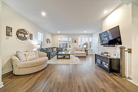 Prime Location! The Mendelssohn (1,917 sq ft) 3 year young end unit grand townhome features 3 bedrooms and offers the convenience of townhome living with the amenities of a single family home. Maintenance free living! This stunning home features an open floor plan w/upgrades throughout. An oversized center island eat-in kitchen complete w/quartz counters, custom subway tile backsplash, and high-end appliances. Upgraded cabinetry includes soft close doors and drawers. Tray ceiling highlights the owner's suite. Spa-like owner's bath boasts a double bowl vanity w/granite counters, ceramic tile surround shower & built-in seat and walk-in closet. Finished walkout lower level game room offers so much additional sq ft. of living and entertaining space. Private Trex deck, concrete patio, mud room, 2nd fl laundry & level entry! Bonus - Connection for an electric vehicle. Pool and community center projected for summer 2024 completion. HOA FEE TO INCREASE TO $150 PER MONTH WHEN COMPLETED