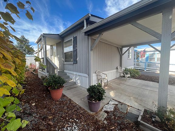 Very nice home in the heart of Klamath Falls! Located at the end of street in a very quiet location, this home boasts a great open floor plan with 3 bedrooms, 2 bathrooms, a nice little backyard with and an attached covered carport. The primary bedroom is a nice size with an attached on-suite bathroom, kitchen is very open to dining and living areas, plus a nice sized laundry room with extra cabinets for storage also. Outside you'll find a storage shed, beautiful landscaping with lots of great flowers. Buyer must get park approval, this is a 55+ park with a clubhouse; monthly space rent is $402 which includes snow removal, water, sewer, garbage and clubhouse use. Brand new heat/AC unit installed in 2023. Schedule your appointment today!