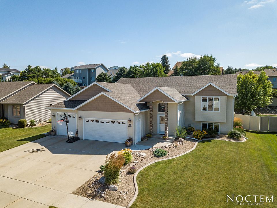 WOW! This 4 bed/3 bath home in NW Bismarck offers everything you would ever want in a home! This home is located with-in walking distance of Horizon Heights Middle School and the New Generation Park. The home features a large kitchen area with plenty of room for entertaining and dining, along with plenty of storage and counter-top space. The main floor lays out with the master suite/bathroom, one additional bedroom, a full bathroom, and laundry room. In addition off the dining area is the COVERED EAST facing maintenance free deck, which was designed with built-in ceiling heaters! The staircase leads down to the stamped concrete fire-pit area that overlooks the professionally landscaped yard and fenced yard, which also has a gas line for a grill! The lower level includes a family room area, with an updated fireplace, a full WET-BAR area, two additional bedrooms, a full bathroom, and plenty of storage space. The 3-stall garage is heated and provides a hot/cold water, a floor-drain, and built-in cabinets. DON'T miss this opportunity to live in this desirable neighborhood in NW Bismarck!