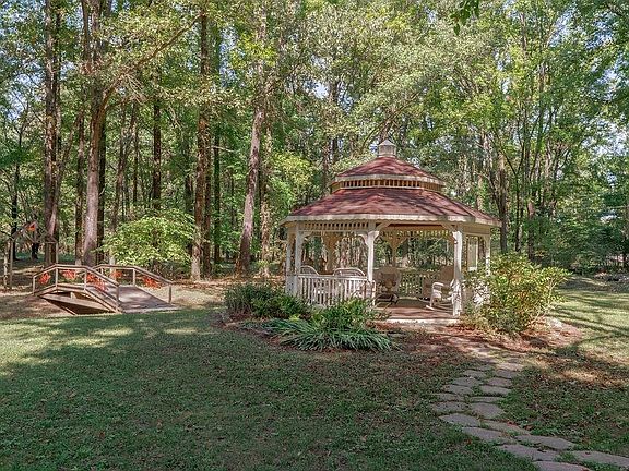 Serene bird-watching paradise on a beautiful 2.08-acre lot! This one-level, 4-bedroom brick home offers the perfect blend of comfort, function, and natural beauty. Outdoor living abounds with a 16' gazebo, a large stone firepit, a front yard swing, a covered front porch, and both covered and uncovered stamped concrete patios. Enjoy the soothing sound of the water fountain and the convenience of leafguard gutters, along with a covered concrete RV parking pad featuring 20-, 30-, and 50-amp power connections, and a spacious 3-car garage. Inside, you'll find a dedicated home office, separate dining and breakfast areas, an induction cooktop and convection self-cleaning oven, abundant cabinetry, a pantry, and an oversized laundry room. Elegant quartz kitchen countertops, granite bath vanities, a striking gas log fireplace, high ceilings, walk-in closets, attractive wood laminate flooring, new carpet, and thoughtful updates throughout make this home a peaceful and inviting retreat.