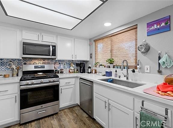 Welcome HOME, to a stunning remodeled 2 bedrooms, 1 bathroom situated in a beautifully maintained gated community. Recently updated within the last 2 years. This Condo features newer kitchen cabinets and quartz countertop, farmer style sinks, stainless steel appliances including gas conventional oven, top of range microwave, dish washer and white fridge, the house also offers new in house hookup washer and dryer, new hardwood flooring new interior painting throughout, new central AC cooling/heating system with brand new furnace installation, new vinyl windows and doors. This home comes with a 1 car garage (with keypad) and 1 assigned parking for your 2nd car, and whole house RO water filtration system and water heater. The community is well taken care of with a pool, spa. Conveniently near schools, shopping center, restaurants and Fwy 22 & 405.