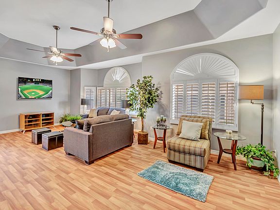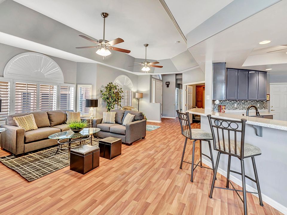 UPDATED LOCK & LEAVE PATIO HOME IN GATED 55+ COMMUNITY OF VERDE GROVES!. MAJESTIC FLOOR PLAN 1623 SQ FT FEATURES 2 BDRMS + DEN, 2 BATHS, PREMIUM LOT ON COMMUNITY GREENBELT WITH PRIVACY WALL ENCLOSING REAR YARD, CLOSE PROXIMITY TO COMMUNITY CLUBHOUSE. N/S EXPOSURE WITH SOUTH FACING PATIO. BAY WINDOWS AT LIVING RM, DINING RM, MASTER & FRONT BEDROOMS. PLANTATION SHUTTERS THROUGHOUT HOME. NEUTRAL CARPET BEDRMS, WOOD LOOK VINYL REST OF HOME. NEW DISHWASHER, REFRIDGERATOR & STOVE. INTERIOR LAUNDRY ROOM & 2 CAR GARAGE THAT IS 19.6 X 24.10. A must see community clubhouse is 10,000 sqft w/multi-purpose rm, full kitchen, library/computer rm fitness center, billiards rm, card rm, craft rm, large covered patio w/BBQ grills, heated pool, heated lap pool, spa, guest parking. Updates include; resurfaced UPDATES TO HOME IN 2019 INCLUDE: ïÆ'Ëœ Re surfaced kitchen & bath cabinets ïÆ'Ëœ Faux Granite kitchen & bath counter tops ïÆ'Ëœ Kitchen back splash ïÆ'Ëœ Wood look vinyl flooring from entry way thru living room, dining room & den ïÆ'Ëœ Kitchen lighted ceiling fixture removed, lighted ceiling fan added ïÆ'Ëœ Living room ceiling fans ïÆ'Ëœ New decorator two tone interior paint ïÆ'Ëœ Metal sheathing added to pull down attic stair opening ïÆ'Ëœ Front hose bib replaced ïÆ'Ëœ Shelving added to front bedroom closet ïÆ'Ëœ 12 panes of dual pane windows replaced ïÆ'Ëœ UPDATES TO HOME IN 2017 ïÆ'Ëœ Wood look vinyl flooring in kitchen, both bathrooms & laundry room ïÆ'Ëœ Master Shower with built in handicap pull down seat ïÆ'Ëœ 2nd bath has Shower with sliding frosted enclosure doors ïÆ'Ëœ Refrigerator Stove 2017 then Dishwasher Dec 2018 ïÆ'Ëœ Electric Garage Door opener replaced & key pad added ïÆ'Ëœ Raised height toilets in both bathrooms ïÆ'Ëœ AC replaced in 2014 ïÆ'Ëœ Water heater replaced in 2013 (manufacture date on water heater is Dec 2012) Owning a patio home in this gated 55+ community is LOCK & LEAVE as HOA includes front/back yard landscaping, water, sewer, trash, cable, common area/exterior & roof maintenance, blanket insurance policy. Verde Groves offers a resort style lifestyle with an over 10,000 sq ft Clubhouse, 2 heated pools, spa, outdoor fireplace, BBQ & covered patio. Inside the Clubhouse features billiards, cards & craft room, fitness room, library with computers, tv room, dance floor & a full kitchen. What a gathering place this is. Many scheduled activities can be found posted on the Clubhouse Bulletin Board and in the community newsletter. Keep in mind that the HOA maintains not only your front & backyard landscape but the exterior structural maintenance of your home...talk about LOCK & LEAVE! This gated 55+ community has a (HOA) Homeowners Association which is currently managed by the professionals at Kinney Management as well as by a Board of Directors comprised of Verde Groves homeowners. The monthly HOA fee of $255 includes such services as: * A blanket insurance policy on each home as well as the community clubhouse and its facilities * Maintenance of the exterior and roof of each home * Roof Replacement * Exterior pest control service * Exterior termite warranty * Maintenance of the common areas of the community * Landscape services of both your front and back yards * COX Basic Cable * Water, Sewer, Trash Collection Verde Groves is an age restricted community & requires one permanent resident per household be age 55 or older and prohibits permanent residents less than 19 years of age. HOA does allow up to 20% of residents to be 40 years or older. Buyer has one time $1500 Capital Reserve fee payable upon Close of Escrow.