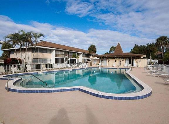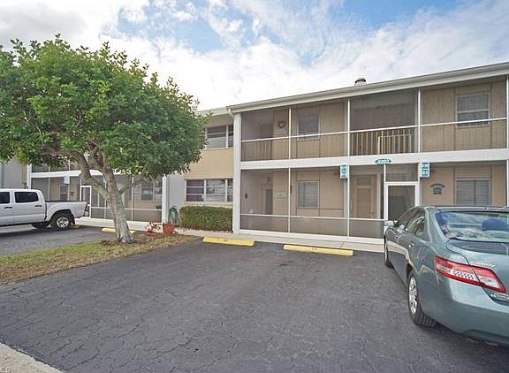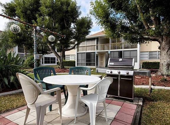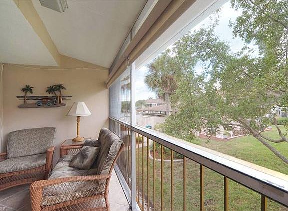Grab your coat and head out to the airport now to start your vacation in this sunny second floor home. Feel the breezes from your screened front and rear porch with beautiful private tree top views. Well designed and maintained over 55 age required community where each unit has a great interior view to the pool ,lush lawn and flowering tree tops. The condo also has a rear staircase down to the large heated pool, shuffle board and club house with billiards and kitchen for community get togethers. Toss some shrimp on the downstairs grill and sit outside and wonder why you didn't come sooner ! This home includes everything to start enjoying your Vacation. TURN KEY tropical inspired in excellent condition.. Immaculate home with updates including 2009 a/c. Light bright kitchen with updated countertops, tile back splashes, newer wall oven, redone ceiling, tile floors. Condo also has an enormous walk in closet to store those beach chairs and coolers for lazy beach days. Sorry not pet friendly and rentals 90 days per yr minimum. There is a free laundry inside the building and is shared with 3 other units. Discover this Cape Coral hidden gem tucked away inside a quiet residential area.