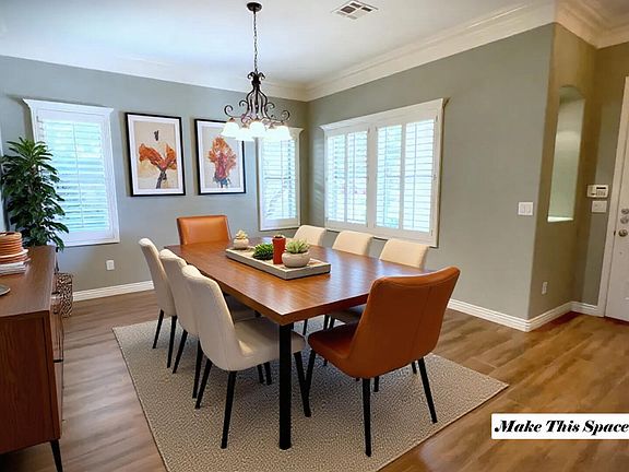 Elegant single-story living is complemented by a peaceful courtyard oasis in this 2,236 sq ft, 3 bedroom, 2 bathroom home with multiple living spaces. Built in 2007, timeless design and an abundance of premium upgrades shine throughout an open floor plan with soaring ceilings, crown molding, and expansive windows that fill the home with natural light. The kitchen features rich granite countertops, a decorative tile backsplash, custom wood cabinetry with crown accents, and a breakfast bar illuminated by designer pendant lighting. The covered patio and landscaped courtyard evoke a retreat, perfect for relaxing or entertaining, framed by mature trees and lush plantings. The climate-controlled garage with coated flooring adds functionality and style. The neighborhood provides access to a community swimming pool, nearby parks, and an extended network of trails, ideal for staying active close to home.