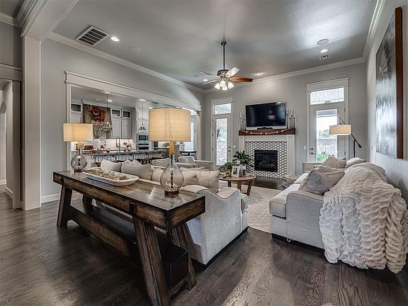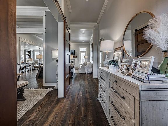 Welcome to the epitome of comfortable luxury living in West Norman's Las Colinas addition. This stunning home features a spacious 3320sf of exquisite craftsmanship and impeccable, timeless design. Upgraded professional landscaping leads you inside to the open floor plan with an abundance of natural light and soaring ceilings. A large formal dining room off the entryway has stunning oversized double sets of barn doors and can also be a downstairs office. The main living area is adorned with a beautiful fireplace, perfect for cozy evenings. Calling all culinary enthusiasts, the gourmet kitchen is a chef's dream come true. Equipped with built in appliances including 5 burner gas cooktop with driftwood vent hood, custom cabinetry, built in coffee bar, wine shelf and hutch in breakfast area, walk in pantry and a large island, this kitchen is sure to inspire your culinary creations. The luxurious master suite offers a peaceful retreat, complete with a spa-like ensuite bath with separate vanities, soaking tub and dual closets. 2 more downstairs bedrooms share a jack and jill bath with separate vanity areas. There is ample space for family and guest to feel right at home. Need a space for work or study? Look no further than the upstairs study attached to the theater/game/optional 4th bedroom with wine fridge and Full bath. Outdoor living at it's finest on this 1/3 acre cul-de-sac lot with a Blue Haven pool with 8" privacy fence between neighbors, custom landscaping and large covered patio with beautiful brick fireplace, perfect for entertaining. The spacious backyard has additional space for play. 3 car garage has a storm shelter for peace of mind. Located in the highly sought after Roosevelt Elem School and Norman North districts, this home offers the perfect combination of luxury, comfort and convenience, being 15 min from OU and 25 min to Airport and Downtown OKC. Don't miss the opportunity to make this extraordinary property your own. Schedule today!