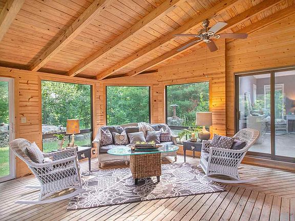 This is the ultimate entertaining home nestled on a secluded 6.22 acres just minutes from Lake Michigan beaches & the harbor town of Frankfort, MI. Spacious 2 1/2 story brick home providing a private hilltop retreat with all the amenities you would want for entertaining in style. Spacious, open concept living, dining & kitchen area on the second floor with wood burning fireplace and hardwood floors. A wonderful three season porch is located just off the dining room with additional space for alfresco dining and entertaining. A slider door provides access to this area from the master suite as well. The master suite has a large, tile floored ensuite with a jetted tub, separate shower and double sinks. Just off the master you'll find an additional private screened porch that leads to a large, private deck with hot tub and sauna. The ground level family room has a second wood burning fireplace and slider door leading outdoors. The third level loft is used as a bedroom with its own private full bath, sitting area, built in desk and private deck. Want company to stay?! Then you'll enjoy the over the garage apartment with a bedroom, living area, bath and efficiency kitchen. Apartment can be accessed from within the house or via separate stairs in the garage. Speaking of garage, you'll love the attached 3 stall garage with large third stall door to allow for storing your boat, camper, etc. Lots of updates and improvements since 2012. See home improvement list and home feature sheet for additional details and information.