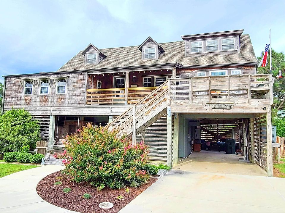 Wow! This home originally resided on the oceanfront in Nags Head and was moved to its current address just two lots from the soundfront where the "Old Hotel" of the nineteenth century used to be. The true Old Nags Head style was painstakingly preserved when it was moved and remodeled in 1995, making this cottage truly one of a kind. Open and covered decking provide the perfect spot to enjoy sunsets over the sound. Ring the weathered bell to announce your arrival or call guests to dinner. Inside, Tongue and groove walls and ceilings throughout are complemented by white rafters and accents that add light and style. The vent-less gas fireplace with granite surround is practical and easy to use. The remodeled kitchen features a pass through window that opens the space, and its ledge has been repurposed for shelving in the renovated laundry area. The resident chef will appreciate the lustrous granite counters, custom cabinetry and stainless appliances An en suite bedroom lies to one side with modern cabinetry and bath fixtures. Two additional bedrooms are on the other side of the living room. Each features a private sink and rough hewn door to the shared walk-in shower. The original porch has been transformed to a Florida room for additional living space. Again, the windows and wood flooring reflect the old cottage style. Head upstairs for an additional bedroom with renovated private bath. Original slanted ceilings and dormers maximize living space and create a cozy space. Prop open the top hinged shutter to keep an eye on the goings-on downstairs! Use the boat ladder in the living room to access the loft that also overlooks below. These spaces truly highlight the craftsmanship of yesteryear. This cottage sits on a 15,000 square foot lot that could accommodate a pool. Currently there is a sprinkler system and large fenced back yard. The double driveway with single carport provides ample parking. The front yard is invitingly landscaped , and there is a storage room, work room, outside shower, and open breezy gathering space at ground level.
