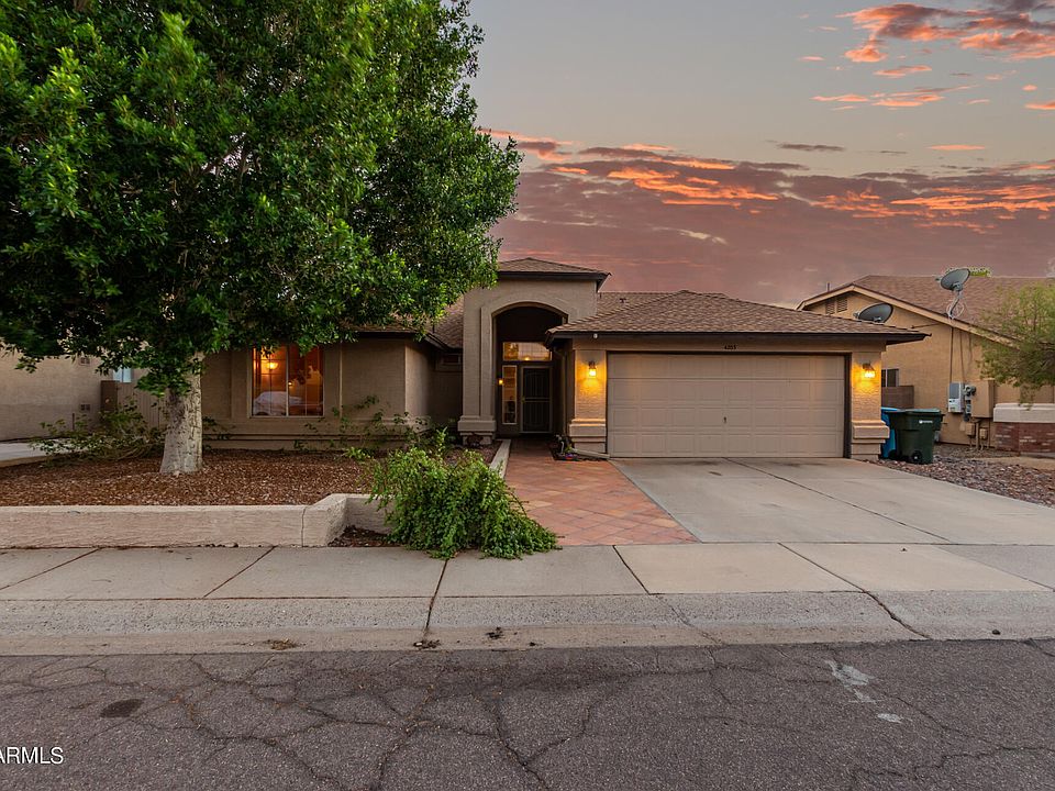 Discover the allure of this lovely single-level residence with no HOA! It flaunts a mature shade tree, Saltillo tile pathway, and a 2-car garage. You'll love the welcoming living/dining room adorned w/vaulted ceilings, tile flooring, soothing paint, charming light fixtures, & bountiful natural light. The heart of the home is the kitchen, fully equipped w/granite counters & backsplash, two-tone cabinetry w/crown molding, recessed lighting, a breakfast bar, & a breakfast room w/backyard access. The main bedroom is a retreat, showcasing a wood-style floor, two mirrored door closets, & an immaculate bathroom w/dual sinks. This gem's elegance extends outdoors to the vast backyard. Unwind under the covered patio or plunge into the refreshing pool, ready to enjoy! Own the home meant for you!